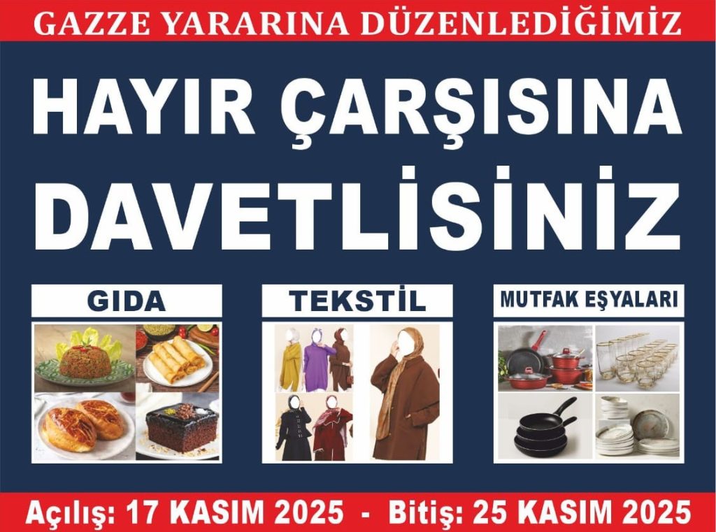 Başakşehir İOSB Tümsan 2 sanayi sitesinde KUDER “kardeşlerini unutma derneği başakşehir temsilciliği” tarafından 17 – 25 kasım tarihleri arasında Gazze yararına düzenlenen hayır çarşısında gıda, tekstil ve mutfak eşyaları başta olmak üzere gazzeli kardeşlerimiz için destekleriniz beklenmektedir.
